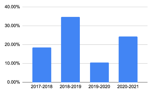 | 2020-2021 | 12.50% | 8 | 4.76% | 21 | 6.90% | 29 |