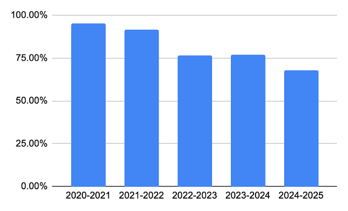 | 2024-2025* | 68% | 25 |